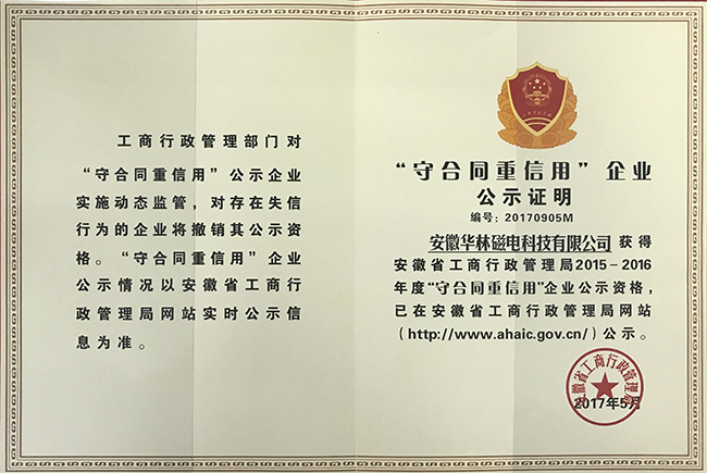 安徽華林磁電堅持信守“誠實信用”原則,不斷開拓進取,充分發揮信用良好的典范作用,為助力五大發展美好安徽建設作出新的貢獻。